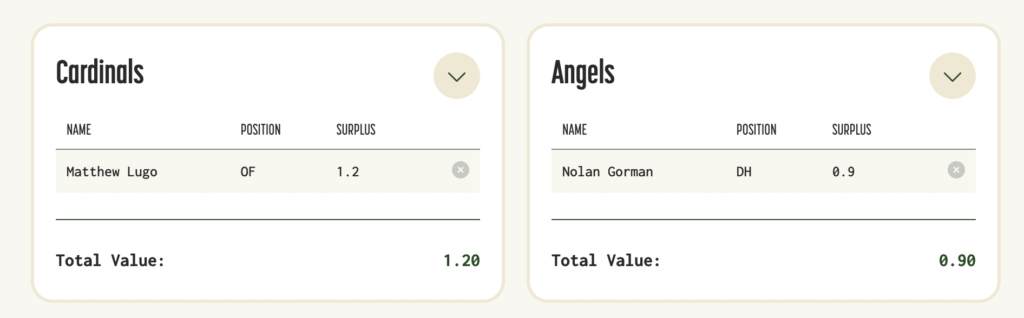 Wrapping up, the additional savings of $8M by letting go of Adell and O’Hoppe also allows us some room to play in free agency a bit. I bring in a reliable reliever with a good four year track record in Phil Maton, and a good bridge piece in Mike Yastrzemski to more gently transition the team to the next generation of outfielders (Alcantara, Raudi, Rada, Hartshorn) we’ve brought into the mix.
