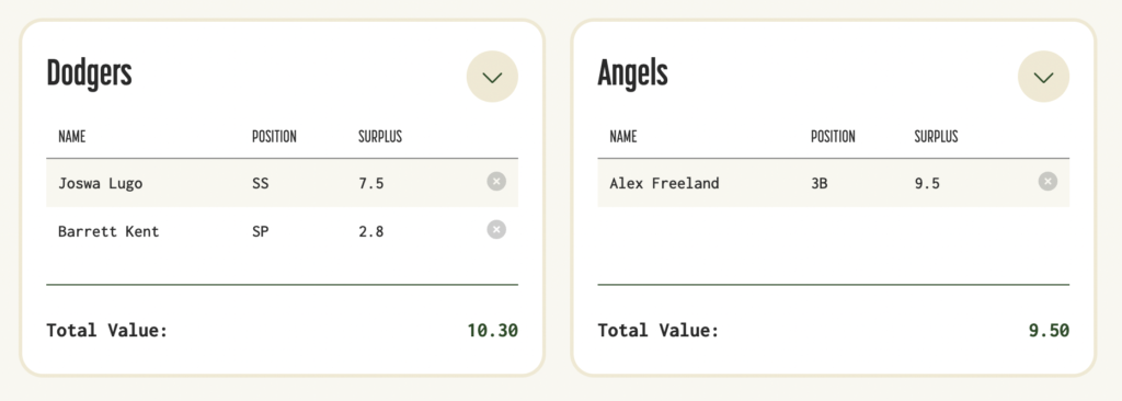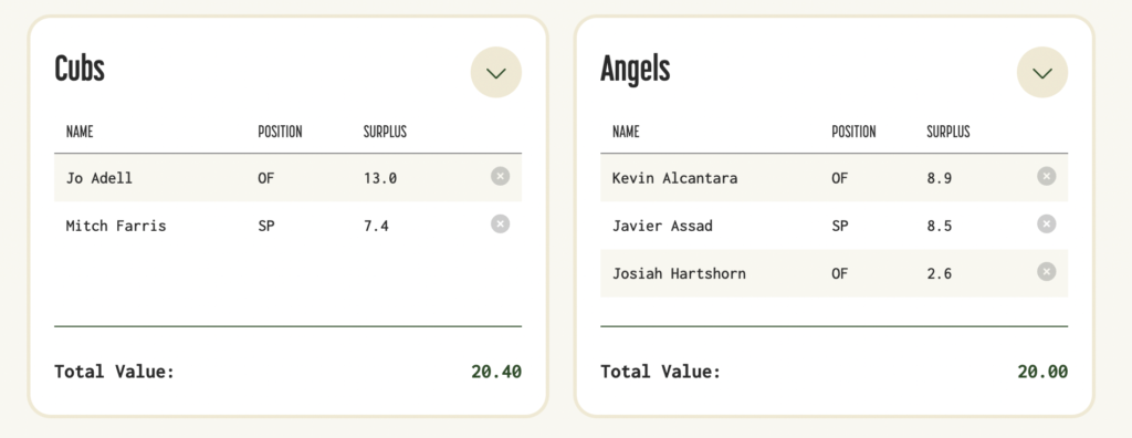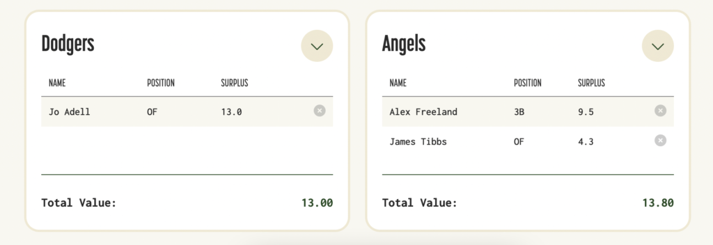 It’s hard to say what the appetite for Adell would be on the Dodgers, but I think this is pretty fair trade that doesn’t subtract much from the LAD’s depth, and also returns a AA prospect with great BB rates and left handed pop (20 HRs in ’25) who might prove a potential replacement for Adell down the road.