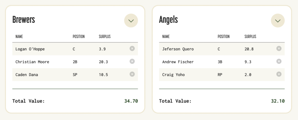 On the one hand, leaving Dana and Fischer out of this trade might make it more plausible, but why not get spicy here at the end? The Brewers are rumored to be seeking an offense-oriented middle infielder they can pair with emerging franchise player Brice Turang, and a catcher to pair will primary backstop Contreras. The acquisition of O’Hoppe blocks Quero in this scenario, and we get a catcher with strong contact skills and low K rate, solid-average power, and a big, big arm with strong blocking skill behind the plate.