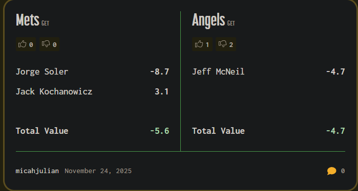 Mets just traded their OF for a 2B, so why not trade them an OF for a 2B? Losing the Jack of 1 trade hurts, but hey, we now have a LEFTY 2B who has played OF as well. I like Jeff, he went to Long Beach State, and considering that the Angels are paying only 13M of Soler, we are getting Jeff at only 2M more to the budget. But also 15M for 2027…