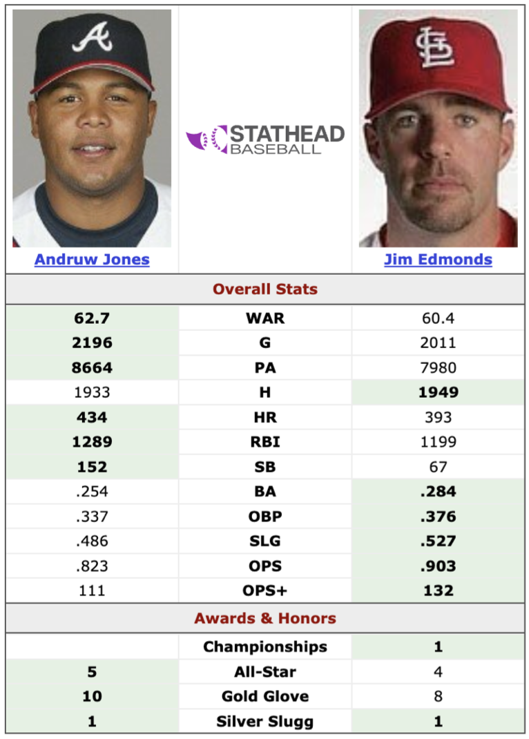 I totally respect Andruw Jones. (Maybe not how is name is spelled – but his game. I love great defense.) But I think Edmonds was better. And to me, the numbers support it. Jones has +24.4 dWAR (the most ridiculous stat in baseball, especially on historic prediction) vs Edmonds +6.4. Jones won 10 Gold Gloves (he was a beast) – but Edmonds won 8 (he was a beast too). Let me remind you Keith Hernandez – an 11 time Gold Glover is a +1.3 Career dWAR. It’s a worthless stat – which makes WAR a worthless stat. I’m a bigger sized HOF fan, because there are so many more teams and players than in older era. They were both HOF caliber players.
