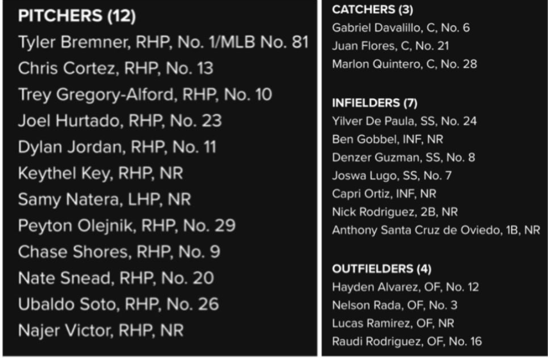 Tyler Bremner, Chris Cortez, Trey Gregory-Alford, Joel Hurtado, Dylan Jordan, Keythel Key, Samy Natera, Peyton Olejnik, Chase Shores, Nate Snead, Ubaldo Soto, Najer Victor